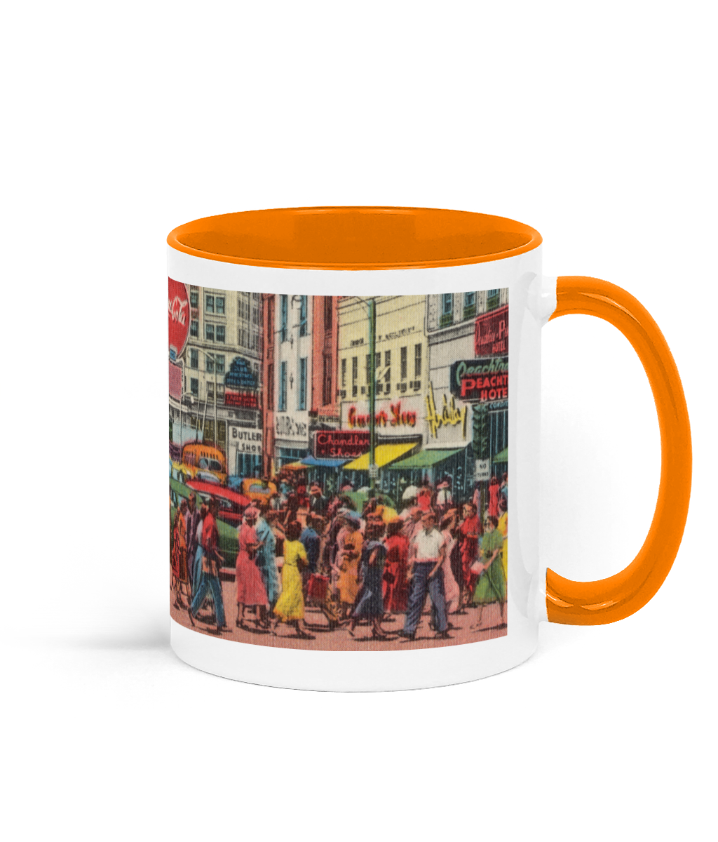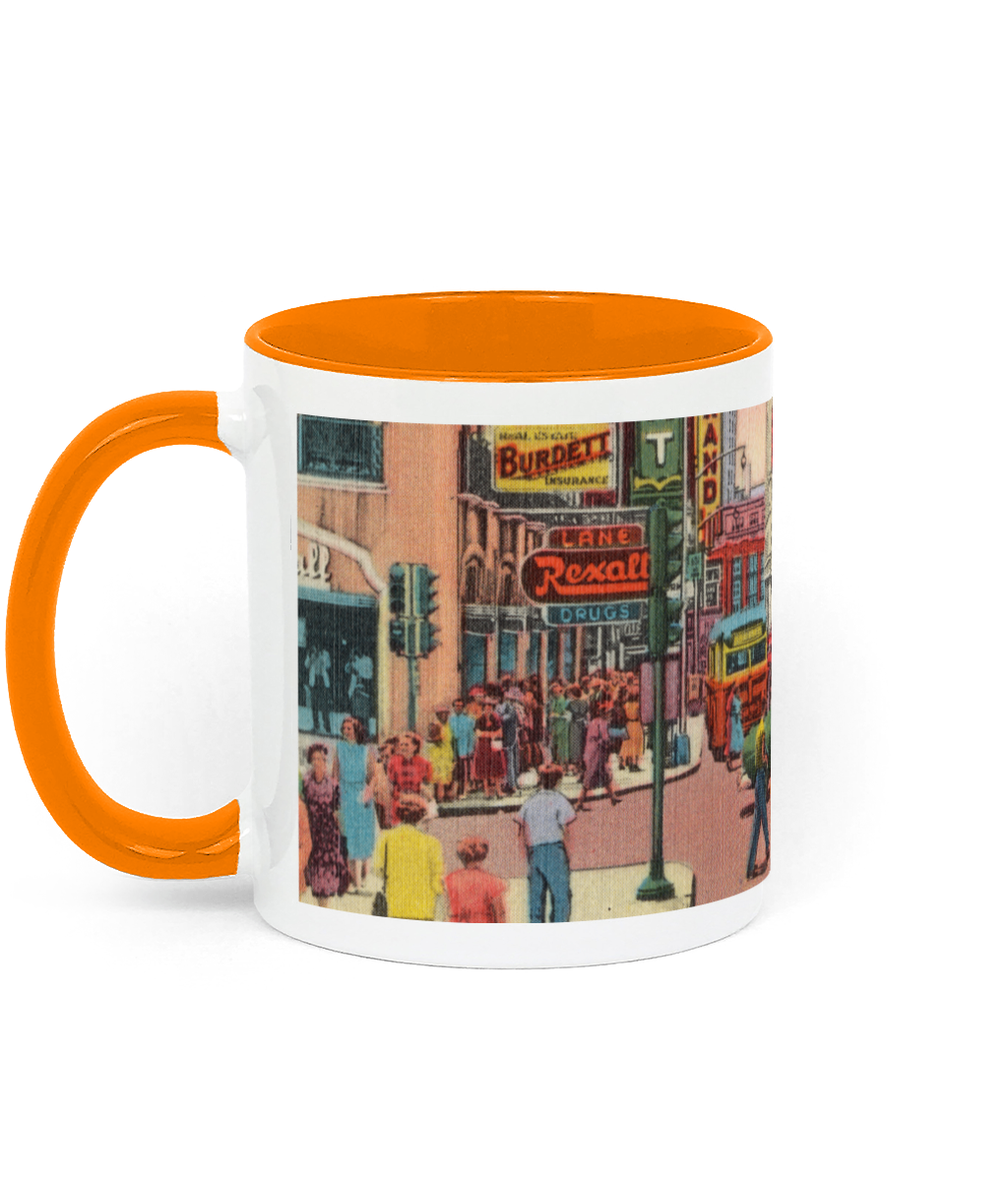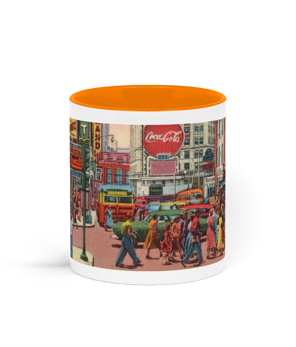A 11oz ceramic mug depicting a vintage USA street scene from the 1940s–1950s. Glossy finish with coloured handle and inner rim. Dishwasher & microwave safe.