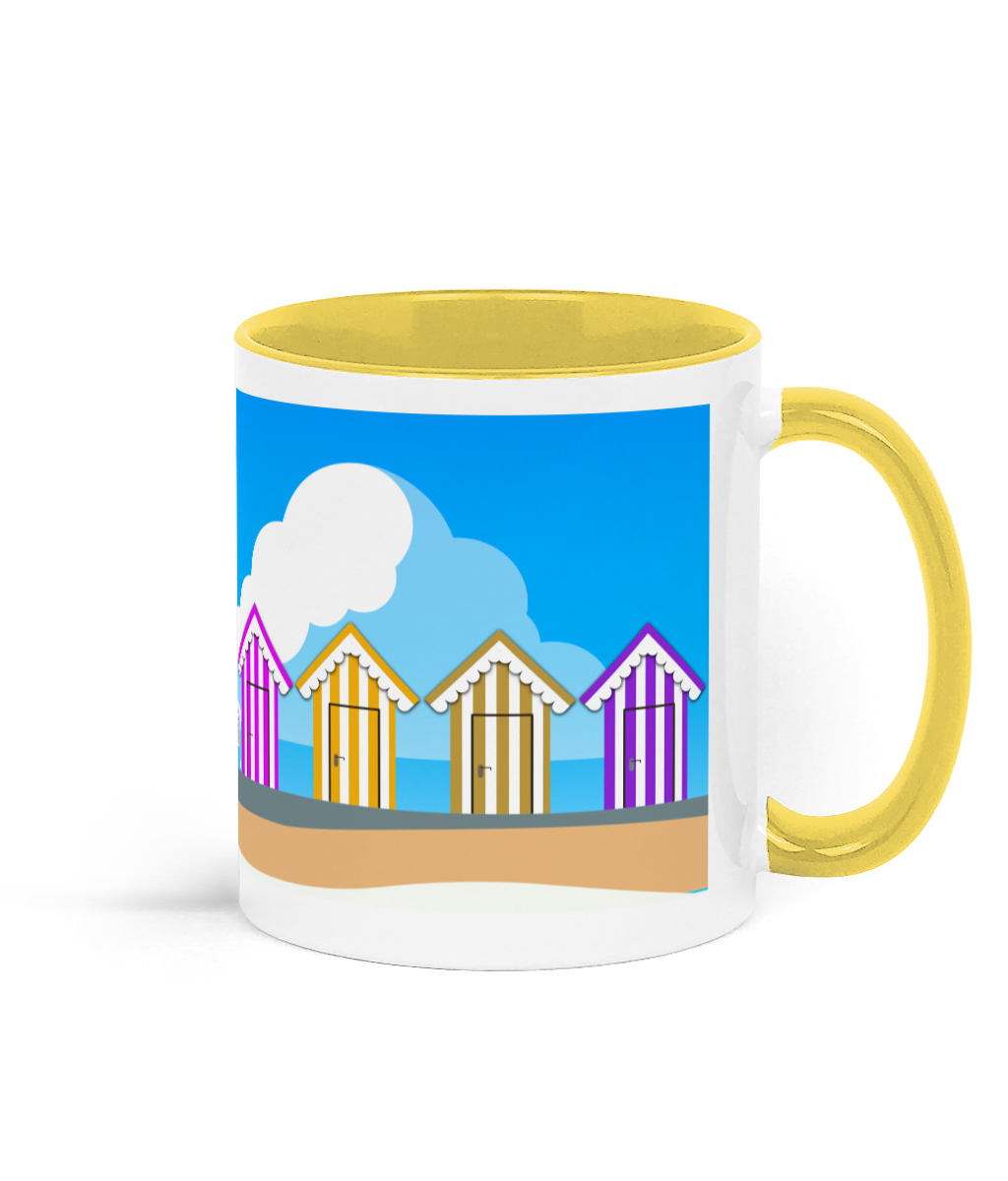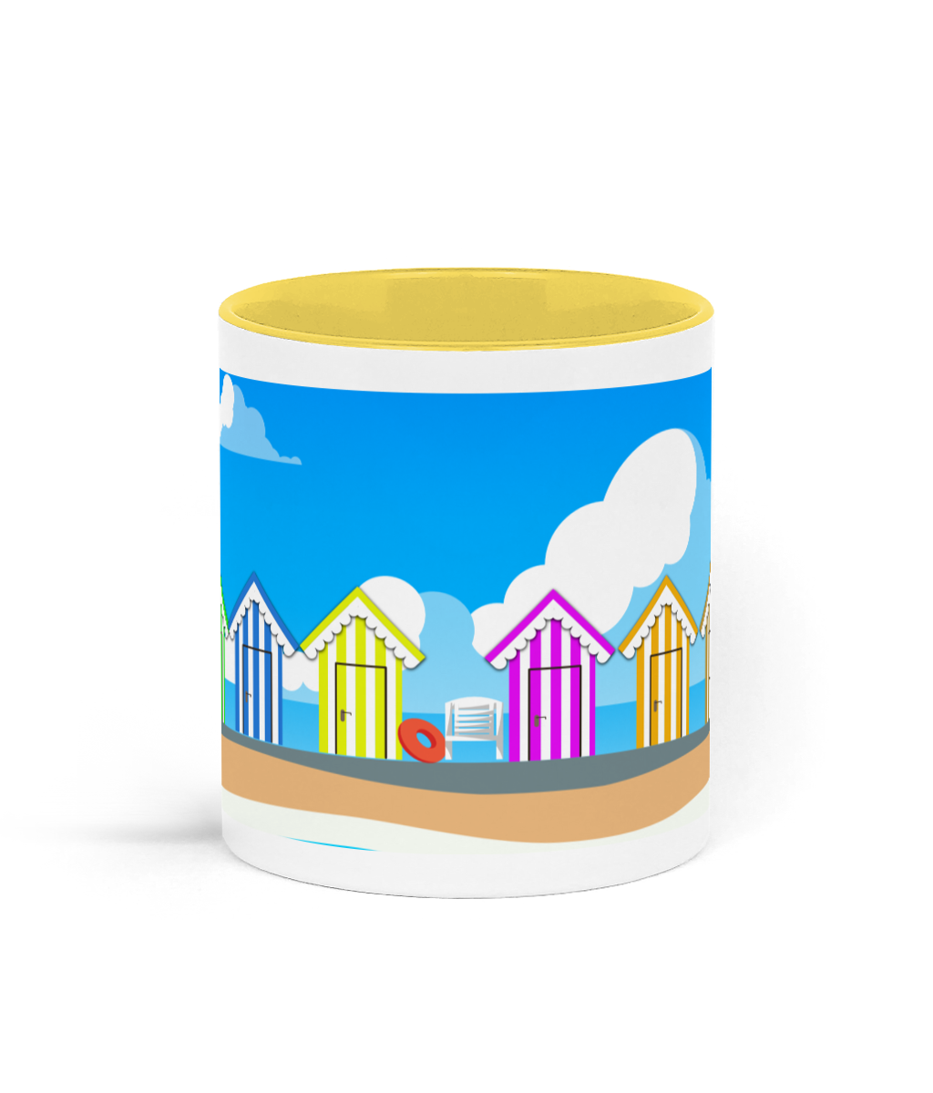 Enjoy a taste of the coast with this charming 11oz ceramic mug featuring a colourful row of seaside beach huts. Glossy, durable, and finished with a coloured handle and inner rim, it’s the perfect way to bring sunny seaside vibes to your daily brew.