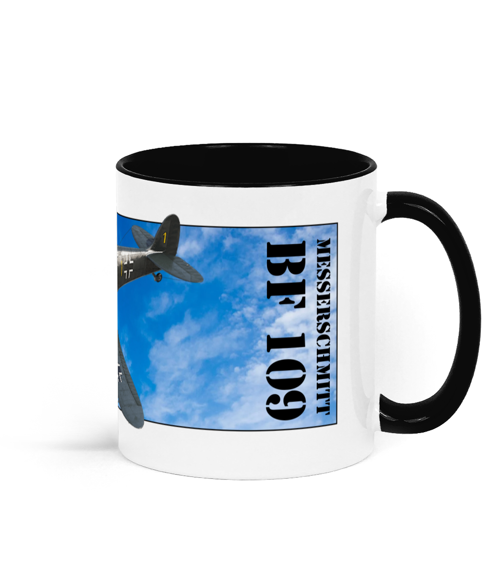 11oz ceramic Messerschmitt Bf 109 mug from the Air Battle Collection. Glossy finish, coloured handle, and dishwasher-safe—perfect for aviation fans and collectors