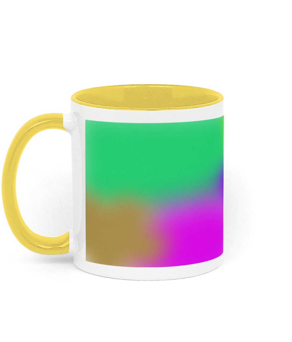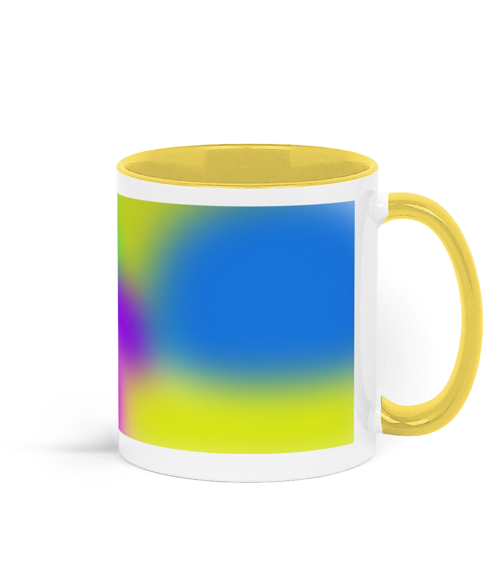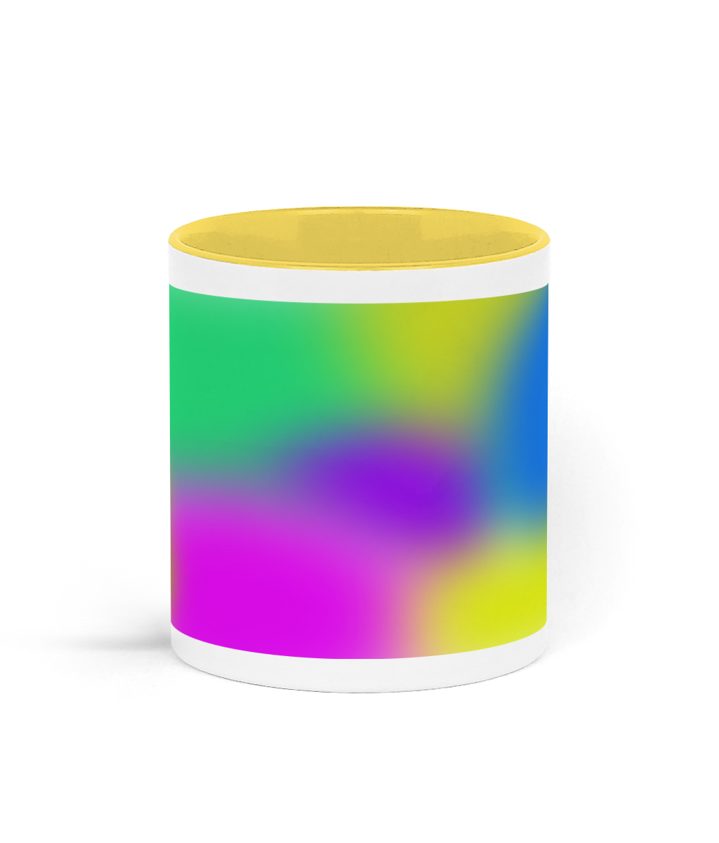 A lively 11oz ceramic mug with a bright, colourful abstract design, glossy finish, and contrasting coloured handle and inner rim. Dishwasher & microwave safe.